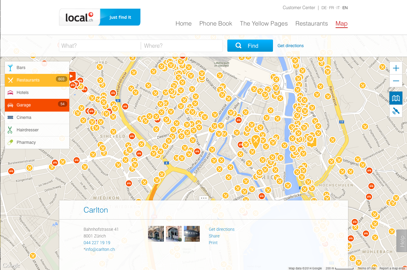 Starting in late 2012, I became team lead for the web engineers, and started working closely with product owners in designing new features. The new local.ch map was challenging, because it involved coordinating the user stories and engineering tasks, together with external design, new search features, and a whole new approach to the front-end stack (namely, Google Maps and backbone.js .)